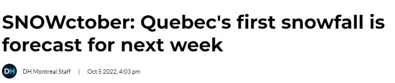 届时,安省北部,魁北克和拉布拉多省的部分地区将“急剧降温”,当温度足够低时,阵雨将变成雨夹雪。气象局表示,加拿大大多数省份(包括魁北克)通常会在10月中下旬开始降雪,并指出10月初的降雪非常罕见。该机构还表示,蒙特利尔上次“早降雪”还是在2015年10月17日,当时的降雪量大约为1厘米。但因降雪量有限,再加上地面相对温暖,“积雪”不会出现。据老农年鉴预测,魁省将迎来一个“非常寒冷、非常多雪”的冬季。