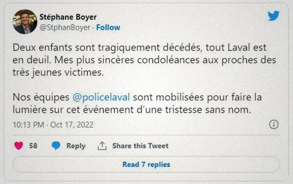 事发数小时后,拉瓦尔市市长斯蒂芬·博耶在推特上发文致哀,他写道:“所有拉瓦尔人都在哀悼。”他补充说,拉瓦尔警察“群情激奋”……“正努力揭露此难以言喻的悲伤”。据报,拉瓦尔警方在昨日下午6点左右接到911报警,赶往位于Ste-Dorothée区Lauzon街的一所民宅。警方在该半独立屋中发现了两个孩子——一名11岁的男孩和一名13岁的女孩。两名儿童情况危急,被紧急送往医院。警方消息人士透露,两名受害儿童均有中毒迹象,且双手被反绑在身后,他们在医院被确认死亡……两个孩子是被淹死的。急救团队发言人表示:“见到此场景的医护人员和警察或多或少都需要心理辅导,我们会向所有参与这件事的人提供我们力所能及的帮助与支持。”