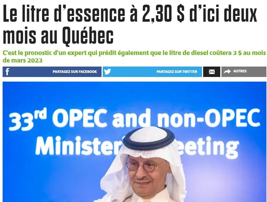 *注:欧佩克+汇集了13个欧佩克(石油输出国组织)国家和以俄罗斯为首的其他10个国家。这23个国家控制着世界40%的产量。以上是欧佩克一号沙特能源部长阿卜杜勒阿齐兹·本·萨勒曼上个月在奥地利维也纳举行的新闻发布会上。这一点得到了蒙特利尔大学国际研究与研究中心 (CÉRIUM) 能源研究员 Yvan Cliche 的支持,他认为许多经济和地缘政治因素都将加剧石油行业的动荡,例如沙特阿拉伯和俄罗斯在内的欧佩克+国家将减少对市场的供应,以推高价格。 Yvan称:“欧佩克在尽力避免像2008年那样的情况,当时原油价格在几个月内从100美金掉到了40美金。同时,他们也担心全球经济衰退,所以不愿把自己放在产能过剩的情况,所以这次他们绝不会轻易增产。”对于使用柴油的加拿大人来说,未来的日子也不好过。冬天来了,大家为了取暖会加大对燃料的需求,也会对柴油的价格造成压力。分析师Dan McTeague称,目前蒙特利尔柴油每升价格在2.61加币,预计到3月,柴油价格每升将上涨到3加币!汽油柴油价格的上涨带来影响的绝不止是通勤成本的增加,预计未来物价还会进一步上涨。