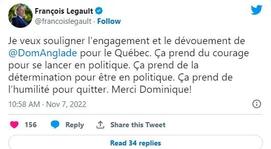 今日上午10:30, 魁北克官方反对党、魁北克自由党(QLP)党魁Dominique Anglade突然召开新闻发布会,宣布从12月1日起辞去党魁一职。同时,Anglade也将辞去魁省国民议会议员(MNA),及Saint-Henri–Sainte-Anne选区议员职务。
