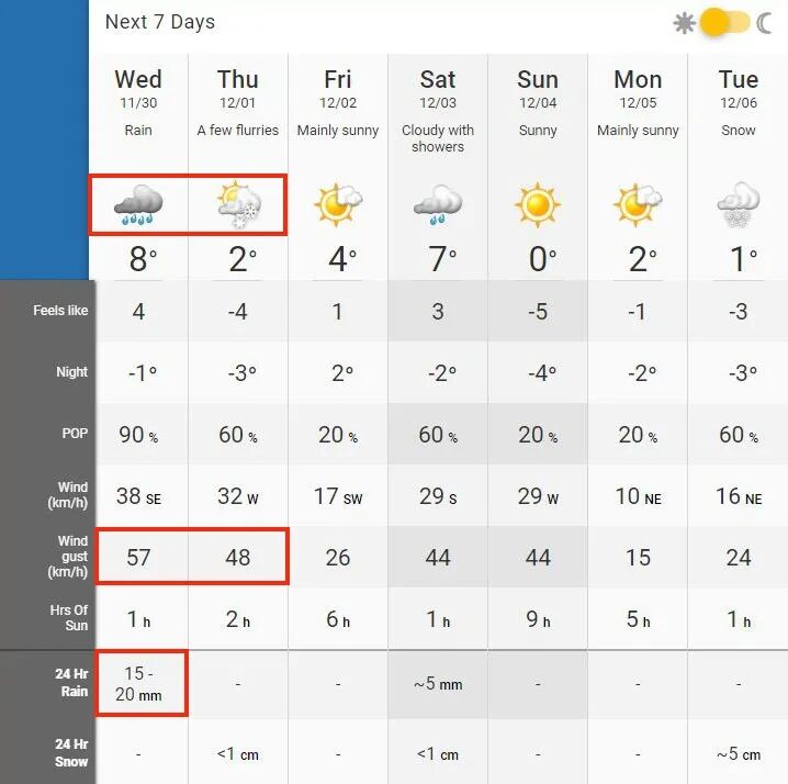 周四(12月1日),气温降低,降雨可能变成小雪,并继续刮风(48公里/小时)。