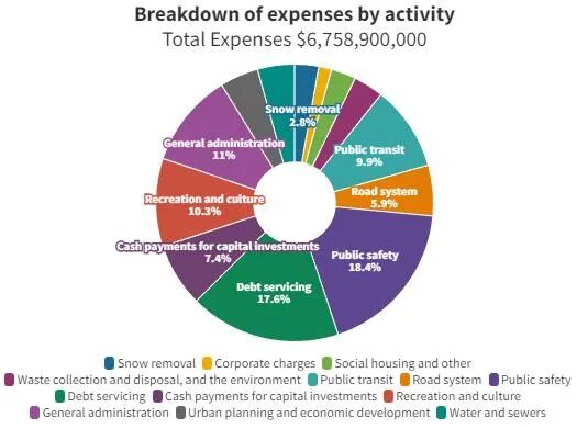 1)对大型室外停车场征收新税(今年仅在市中心生效,2023年在蒙特利尔所有行政区生效),预计每年可增收$500万元。该税将适用于所有超过20,000平方米的停车场。市政府表示,这项税收旨在鼓励“最佳”土地利用。收入将用于为公共交通提供部分资金。2)2023年起,对非住宅物业征收新的用水费,预计每年可增收$1500万元。相关业主将在明年收到一张无需缴税的“虚拟账单”,账单显示他们在2022年的用水量。该账单的目的是让他们有个心理预期,明白优化用水的重要性。2014年,业主将收到第一份实际账单,账单将显示2023年的用水收费。水费将从1,000立方米起征——1,000至10,000立方米用水将按每升10分征税;10,000至100,000立方米之间的税率为每升20分;超过100,000立方米的部分,用户将支付每升60分。2023预算中,“公共安全(Public Safety)”是最高支出项,占比18.4%。其中大部分资金将来自于魁北克政府为增加警力而批准的一项五年资助计划。蒙特利尔警察部队的预算将增加$6320万元,并计划从现在到2025年再额外招收270名警察。第二大支出项是“债务服务(Debt Servicing)”,占比17.6%。“行政管理”排在第三位,占比11%。