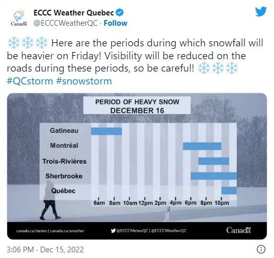 本周初,气象局发布警告称,始于美国科罗拉多的一个低压风暴系统狂奔3000公里于本周内抵达加拿大,萨省,曼省,安省和魁省难逃一劫。不过,按照加拿大环境部气象学家特里朗表示,这种风暴每年都有,算是当季的典型风暴。对于蒙特利尔人来说,本次降雪主要集中在周五和周六两天。蒙特利尔岛、Longueuil-Varennes、Laval和Châteauguay-La Prairie等地均发布了降雪警告。