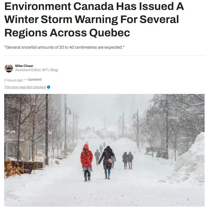 注意,今日早晨,加拿大环境部向魁省20多个地区再次发布冬季风暴警告。警告称:“今天晚上,低压风暴系统将进入魁北克,届时多个地区将迎来强风和大雪。”魁北克受到低压风暴影响的地区包括Abitibi、Charlevoix、Lac-Saint-Jean、La Tuque、Laurentians、Mauricie、Montreal、Mont-Laurier、Québec、Saguenay 和 Upper Gatineau 等。今晚起到周五,以上地区将迎来20-40厘米大雪,有些地区甚至可能看到有60厘米大雪。大雪伴随70-80公里/小时强风,“吹雪”现象导致当地能见度降至为零。蒙特利尔等圣劳伦斯河附近地区周五早上会有冰雨,马路变成溜冰场。今晚与明天的驾驶条件同样十分恶劣,请大家安排好出行计划。周五晚上开始一直到整个周末,蒙特利尔地区还会再迎5-10厘米降雪。大雪和冰雨,可能导致树枝折断,电线受损而引起的大面积停电,请大家做好准备。https://montreal.ca/en/snow-removalhttps://www.agencemobilitedurable.ca/en/practical-info/snow-clearing.htmlhttps://servicesenligne2.ville.montreal.qc.ca/sel/inforemorquage/index?lang=enhttps://services.montreal.ca/deneigement/avancementhttps://www.laval.ca/Pages/Fr/Citoyens/info-deneigement.aspx?lcidsync=1https://www.longueuil.quebec/fr/services/deneigement