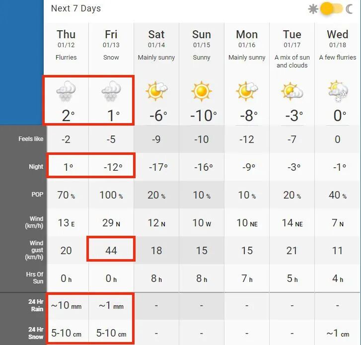 周四周五两日白天最高气温并不低,0℃以上(1-2℃)。周四夜间最低气温1℃,周五夜间最低气温-12℃。