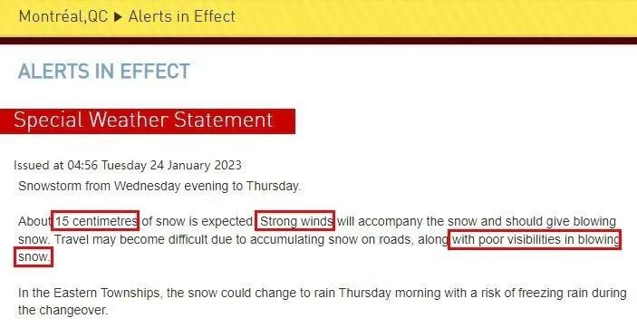 周三晚上至周四,魁省地区降雪量可达15厘米。期间强风吹雪令道路能见度变低。周四上午,Eastern Townships地区雪转雨期间或有冻雨大冰壳。