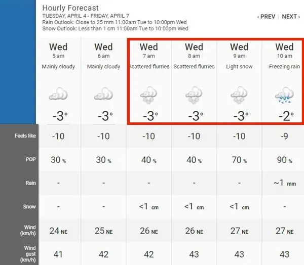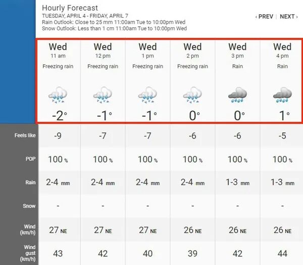 在Outaouais、Eastern Townships和魁省中部地区,预计积冰5-10毫米。在Mauricie、魁北克城和Chaudière-Appalaches地区,预计也会出现冻雨,但降雨量尚未确定。环境部警告说,地面及物体表面均将结冰、变滑,树枝与电缆可能会在冰的重压下断裂,导致停电。冻雨期间,受影响的大部分地区还将有时速40公里-60公里的东北风。按照蒲福氏风级定义,41-51公里/小时是“6级强风”,52-62公里/小时是“7级疾风/劲风”。加拿大环境部预测,本场冻雨过后,周四的气温将会显着上升。