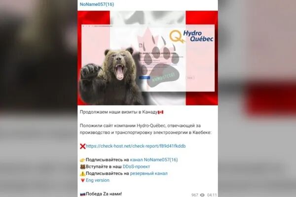 一个名为“NoName057(16)”的亲俄组织声称对此事负责,但并未说明其针对Hydro-Québec的具体原因。该黑客组织在他们自己的网站上用俄语写道:“负责在魁北克发电和输电的公司Hydro-Québec的网站被关闭了。”