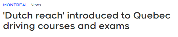 据CTV今日报道,魁北克汽车保险委员会SAAQ的培训课程,现有交规考试引入了一个新的规则——Dutch Reach(荷兰式开门法)。同时,SAAQ也要求魁省所有司机都必须对其有所了解。“荷兰式开门法”要求司机在开车门前必须向后看,观察车附近的所有情况,避免后面跟进的行人或骑行者躲闪不急……也就是咱们俗称的“开门杀”。骑车人摔倒后,若后方有其他车辆没有及时刹车,会造成严重的二次伤害,甚至致其死亡。SAAQ现已将“荷兰式开门法”(Dutch Reach)纳入道路安全教育计划中,新手司机将学习“OEA”法则,即在想要离开车辆时,必须遵守“先观察(Observe),再评估(Evaluate),最后行动(Act)”的顺序)。新司机想要拿到驾照,就必须在开车门前检查后视镜,侧视镜和车侧的盲区。魁省驾校将在今年12月之前逐渐引入这个新条款作为学习内容。