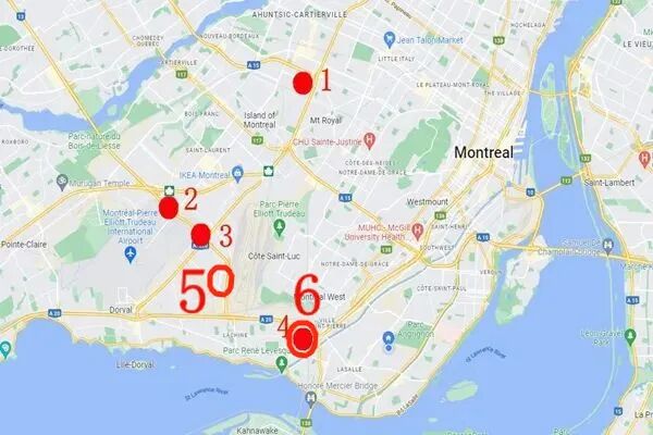 值得注意的是,这12辆被烧毁的汽车并不是停在一起的(两边都有)——很明显,它们被人故意点燃……警察很快便在现场发现了助燃剂。该场汽车大火也蔓延至停车场旁的一栋商业建筑。火灾中无人受伤。警方当日表示,现在就将这场火灾和过去几天发生的火灾联系在一起还为时过早——就在11月2日晚上至3日早上,蒙特利尔多地至少有16辆汽车着火。其中一场火灾就烧毁了至少10辆汽车。小编总结了去年“48小时内4次汽车火灾”的发生地(图中1/2/3/4),以及今日两场火灾发生地(图中5/6)的位置图: