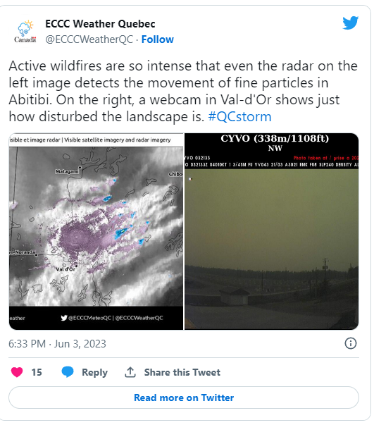 加拿大环境与气候变化部早上联合发布了这一烟雾警告:“由于森岭火灾的数量不断增加,森林大火所产生的高浓度细颗粒物将导致今天许多地区空气质量不佳。”ECCC在推特上写道:“森岭大火火势如此强烈,甚至左图中的雷达都能探测到Abitibi的细小颗粒的移动。右图中,Val-d'Or的网络摄像头显示了视线受干扰的程度。”今天上午不少朋友在朋友圈发文并配图称:“天空怎么是黄色的?” 这其实就是森林大火导致的。ECCC表示,今天下午的空气质量会继续恶化,预计到周二空气中的污染物浓度会非常高。建议患有呼吸系统疾病和心脏病的人,例如有哮喘的儿童,在警告生效后避免在户外进行剧烈的体育活动。-Drummondville - Bois-Francs-Haute-Gatineau - Lièvre – Papineau-Montréal métropolitain – Laval-parc national de Forillon - Gaspé – Percé-vallée du Richelieu - Saint-Hyacinthe-Vaudreuil - Soulanges - Huntingdon截至周日晚上,魁省发生了150多起森林大火,与安省接壤的Abitibi-Temiscamingue地区、Sept-Iles北岸社区及Lebel-sur-Quevillon等地区影响严重,居民不得不疏散,已有上万人离开家园。