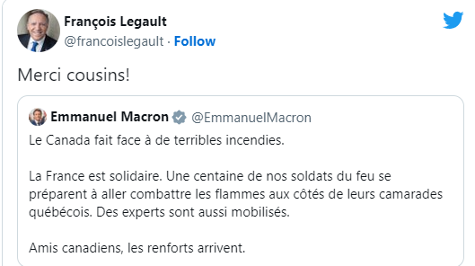 法国总统埃马纽埃尔·马克龙周日发推表示“将派遣100名消防员到魁北克来一起灭火”。他用法语写道:“加拿大朋友们,援军来了!” 魁省省长Francois Leagault用法语回应:“谢谢大表哥!(Merci cousins!)https://montreal.ctvnews.ca/smog-warning-in-effect-in-montreal-due-to-quebec-wildfires-1.6427288https://www.ctvnews.ca/climate-and-environment/macron-announces-france-is-sending-100-firefighters-to-quebec-1.6426931