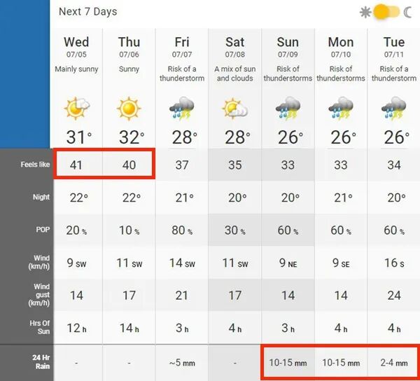 天气预报显示,周三周四高温之后,魁省多地仍将处于高湿状态。虽有降雨,但却很难改善气温。蒙特利尔未来一周的白天最高气温将持续稳定在33℃左右。