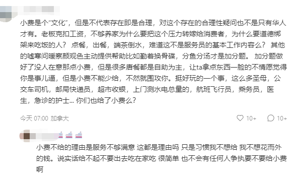 由于“Papa Jackie”在蒙特利尔华人社区中颇有知名度,再加上话题相当具有争议性。只一天的功夫,Jessica的帖子下面就已有上百条评论。大家的评论……两极化严重,有人站Jessica,有人站收银员。支持Jessica的人认为,加拿大的中餐厅服务做得相当不到位,点餐,出餐,端茶倒水都是分内工作,主动为客人做分内工作以外的工作,比如勤着换骨碟,分鱼分汤才是加分题,小费确实应该与客人满意度挂钩。但也有人认为,虽然没有“强制小费”,但是在北美吃饭给小费是本地文化,就算不满意也要给,要入乡随俗。还有人指出,帖主并没说“服务绝对不好”,只是“没有特别服务”,按照道理,那也应该给10%。一分钱/小费都不给的情况,必须是“一点服务都没有”,或者“服务生态度特别差”。从现在情况看,她没有理由一分都不给。