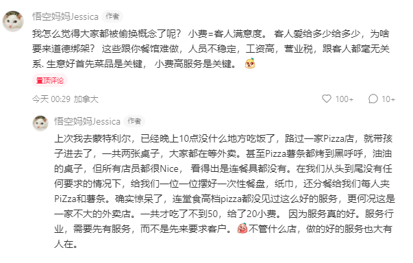 在文尾,Jessica强调自己并不是因为没有给小费的习惯才不给小费,是因为对服务不满意才没给小费。“在全聚德(渥太华和多伦多有店,蒙特利尔没有)定包房,人家会提前告知顾客,最低消费是500刀,强制20%服务费,点菜前会再告知一次。我们给完服务费,给完税,还会再单独给服务人员小费,因为对服务感到满意。”“我又不是第一次吃龙虾,龙虾不用上叉子吗? 既然游水龙虾,按磅收费,一开始说大约两磅,就算不给客人确认死活,是不是也应该报出实际重量按实际重量来收费呢? 你家龙虾每一只都是同卵双胞胎, 身高体重都一样?”不久后,Jessica在评论区再次强调“小费=客人满意度”,拒绝任何道德绑架。
