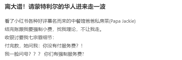 昨天,小红书上@悟空妈妈Jessica发表的贴子引发了蒙特利尔华人社区的激烈讨论。Jessica在文中说在蒙特利尔爸爸私房菜用餐时遭遇了强制小费,请蒙特利尔的华人们来评评理。