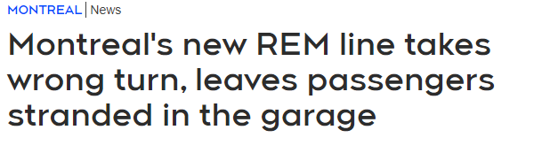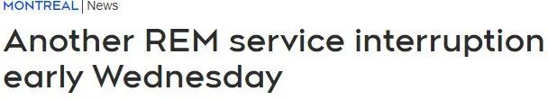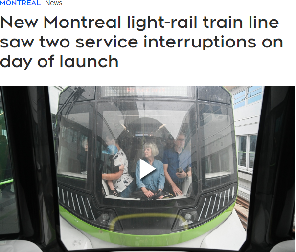 本周一是蒙特利尔轻轨正式运行的第一天,结果24小时内由于轨道切换故障REM系统服务中断了两次,一次是早上早高峰,中断持续了近一个半小时,使一部分乘客被困车厢内一个多小时,还有大部分乘客不得不再次排长龙等公交。另一次发生在周一晚上11点左右,也持续了大约一个多小时,所有乘客也再次被REM安排的巴士送走。