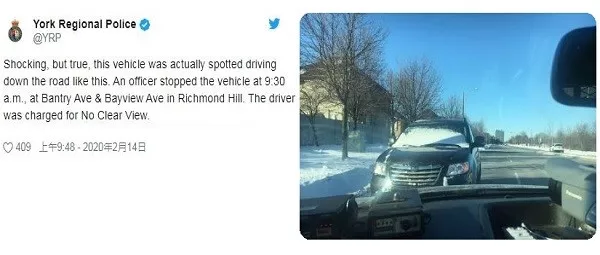 大多约克区警察近日在烈治文山Bantry与Bayview路口附近截停了一辆汽车,并给该名司机开出110元罚单,原因是“其在视野不清的情况下驾驶车辆”。据警方在推文中贴出的照片显示,涉事车辆的挡风玻璃除左上角一片能“仰着脖儿、跳着脚儿”看到路况外,其他地方几乎全都被冰雪遮盖。从未见过如此违章的警察在推文中上来就喊:震惊,但却是真的……(Shoocking,but ture……)