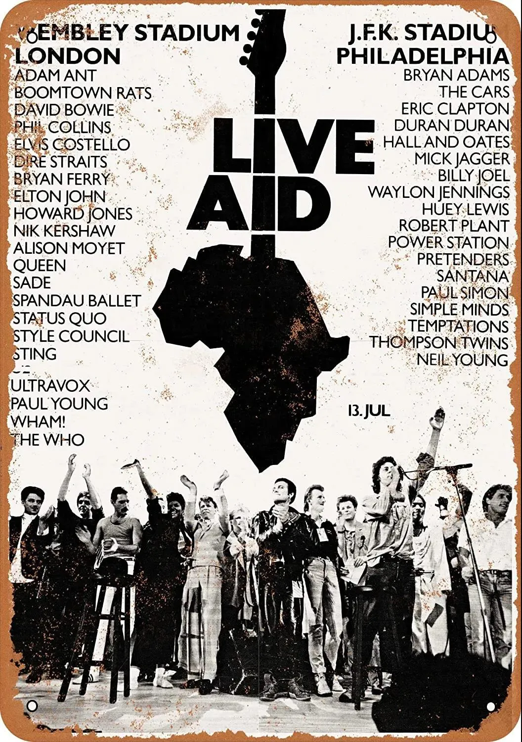 1985年7月13日,一场名为Live Aid「拯救生命」的大型摇滚乐演唱会,在英国伦敦和美国费城同时举行。世界100多位最顶尖音乐人参加了此次义演,包括大卫·鲍伊、鲍勃·迪伦、保罗·麦卡特尼、琼·贝兹、U2、滚石、皇后乐队、菲尔·柯林斯、艾尔顿·约翰、斯汀、麦当娜等巨星同台,全部无偿参演。