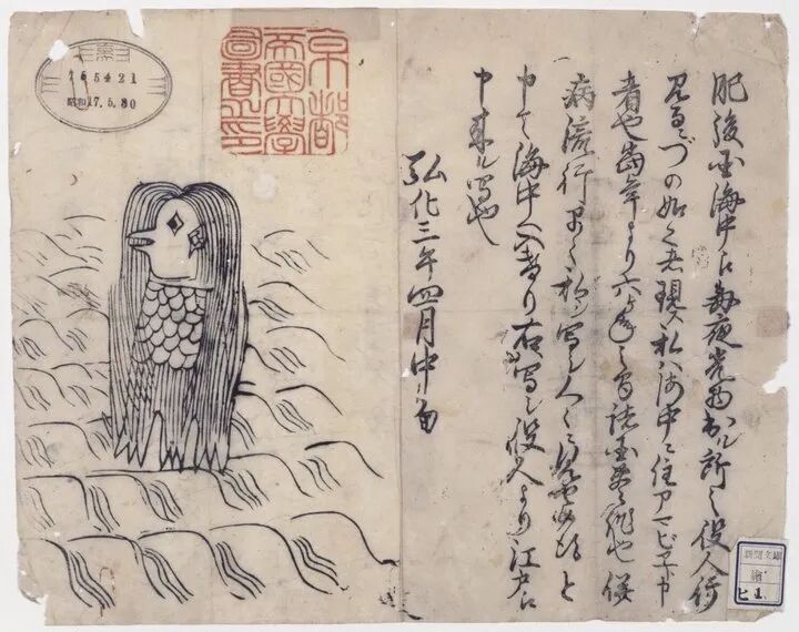 在“终结疫情”的祈愿下,人们将百年前的“妖怪”复兴了——最早那张由官员手绘的Amabie画像,一直被保存在京都大学附属图书馆,“被遗忘”至今已有174年。