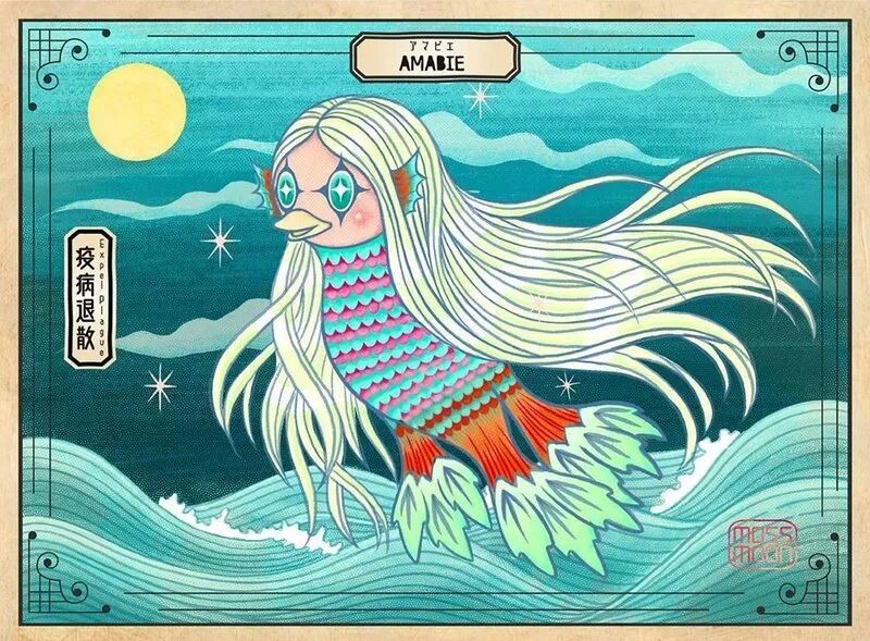 “我住在深海,名叫Amabie,今年6月,日本会五谷丰登,但同时,一场大疾病也会流行。到时请把我的样子画下来,传给众人看,就能保平安。”