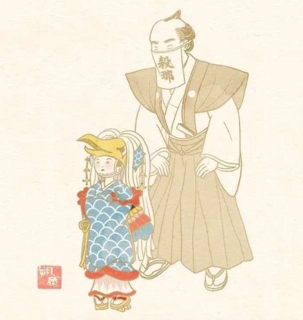 ↑ 插画家Izumi Sakuan也画出了他的幻想,“在江户时代的节日庆典上,为庆祝(当年)疫情的结束,孩子们一定会打扮成Amabie的模样。”