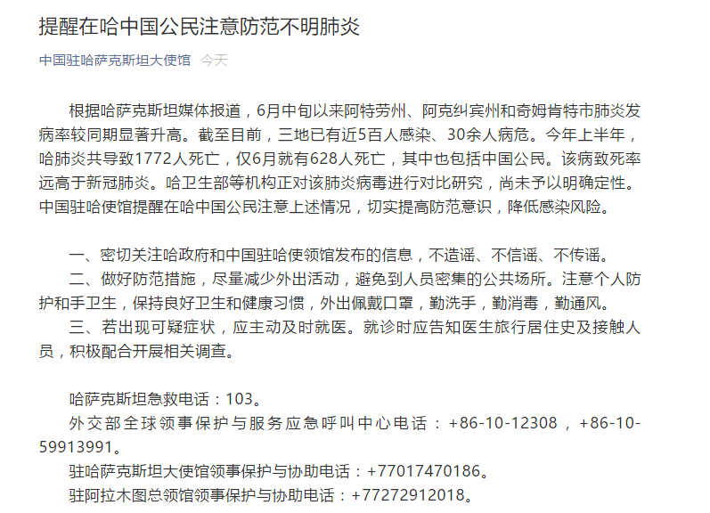 哈萨克斯坦近日出现不明原因肺炎,其致死率高于新冠肺炎。同时,哈萨克斯坦成为全球首个因新冠肺炎疫情扩散而再度采取全面隔离措施的国家!7月9日,21世纪经济报道记者从中国驻哈萨克斯坦大使馆微信公众号获悉,中国驻哈萨克斯坦大使馆提醒在哈中国公民注意防范不明肺炎。中国驻哈萨克斯坦大使馆称,根据哈萨克斯坦媒体报道,6月中旬以来阿特劳州、阿克纠宾州和奇姆肯特市肺炎发病率较同期显著升高。截至目前,三地已有近500人感染、30余人病危。今年上半年,哈肺炎共导致1772人死亡,仅6月就有628人死亡,其中也包括中国公民。该病致死率远高于新冠肺炎。哈卫生部等机构正对该肺炎病毒进行对比研究,尚未予以明确定性。中国驻哈使馆提醒在哈中国公民注意上述情况,切实提高防范意识,降低感染风险。中国驻哈萨克斯坦大使馆指出,当前,哈疫情进入新一波高峰,政府已于7月5日重启为期2周的隔离限制措施,形势仍然十分严峻。截至7月9日10时,哈全国累计确诊新冠肺炎病例53021例,日增长率3.8%。累计治愈35137例,死亡264例。7月8日,托卡耶夫总统发表电视讲话,表示哈新冠肺炎疫情形势仍然严峻,民众应充分认识病毒威胁,把它视为普通流感是错误的。目前,全球确诊人数超过1200万,50多万人死亡。哈在疫情之初果断采取严格措施,有效防止疫情蔓延。托坦言哈卫生系统尚不具备应对大规模感染的能力,加之民众不遵守隔离制度、原卫生部领导层系统性错误、地方政府的行动迟缓等原因,哈不得不面对第二波疫情。考虑到这些因素,哈再次采取为期两周的隔离措施,未来14天是关键时刻。托卡耶夫宣布将7月13日作为全国哀悼日,悼念死于新冠肺炎的民众。哈卫生部国家公共卫生中心流行病学鉴定中心主任、流行病学家斯玛古尔呼吁民众尽可能留在家中,避免感染病毒,有症状时尽快就医,不要盲目进行自我治疗。日前,哈一网站援引英国《每日电讯报》文章称“哈萨克斯坦成为全球首个因疫情扩散而再度采取隔离措施的国家。”“哈取消国家紧急状态、放宽隔离制度后,民众不再遵守防疫规定,四处走亲访友、聚会聚餐、举行婚礼,国际航班恢复后开始飞往国外。全国各地感染人数激增,政府被迫重新实施隔离措施。”