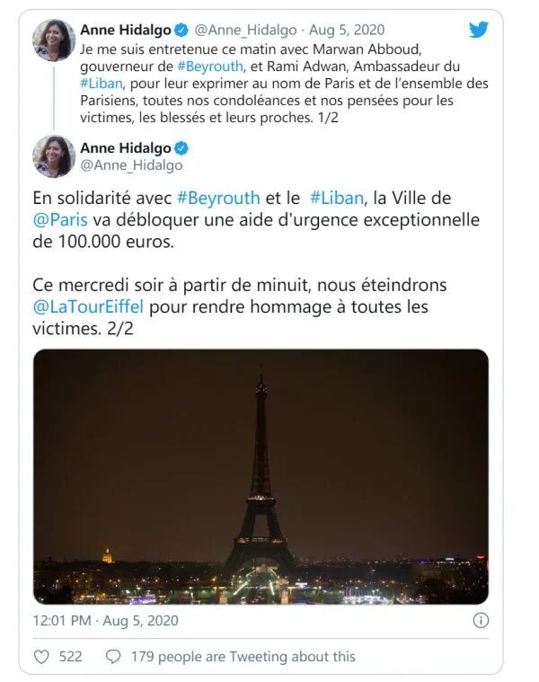 昨日,法国一架空客A400M运输机和一架空客A330 Phénix已经出发,搭载超过20吨救援物资,及由法国内政部、外交部、卫生部工作人员、55名专业搜救人员组成的救援队伍。今日,法国外长确认,法国还将派出第三架人道主义救援飞机。据法国CNEWS电视台报道,事实上,几十年来,法国一直致力于发展与中东国家黎巴嫩的紧密关系。历史也已证明,法国政府一直在参与黎巴嫩事务。