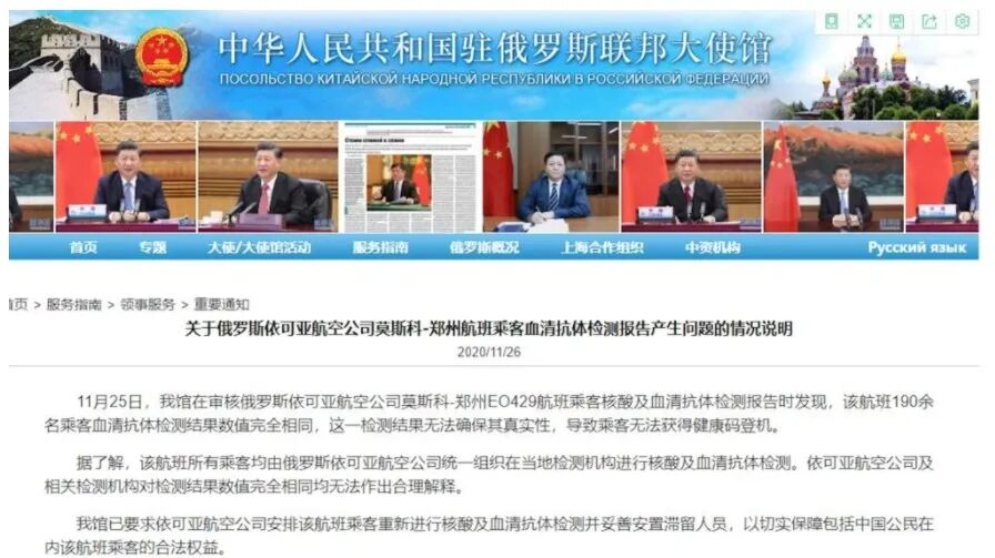 莫斯科当地时间11月25日,因190余名乘客健康码突然转黄而无法登机,从莫斯科飞往郑州的俄罗斯依可亚航空公司EO429航班被迫取消,最终导致这些中国乘客滞留机场近20小时。中国驻俄罗斯大使馆次日于官方微信公众号发布情况说明。大意为:当日发现190余名乘客血清抗体检测结果数值完全相同,而涉事航空公司及相关检测机构均无法对此作出合理解释……由于相关人等的检测结果无法确保真实性……使馆已要求依可亚航空公司安排该航班乘客重新进行核酸及血清抗体检测。国内媒体《红星新闻》记者采访到该航班乘客,试图还原其中始末——190余名乘客“一模一样”的检测结果究竟从何而来?