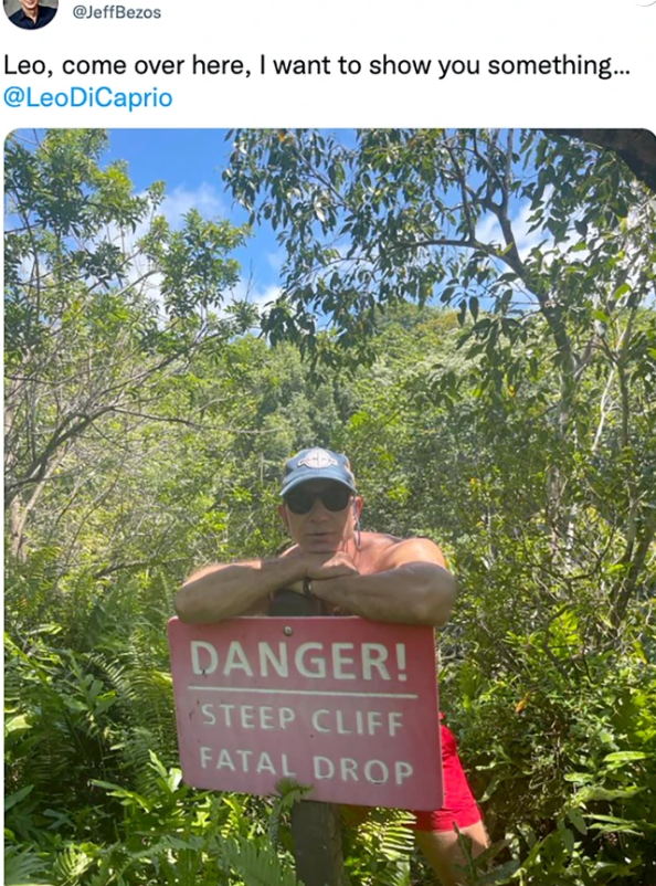 只见照片中的贝佐斯身在野外,赤膊上阵,趴在一块警示牌上,警示牌上写着:“危险!悬崖峭壁,跌落致命”这让不明真相的群众们一头雾水,这两人平时也没啥交集啊,为啥突然发个“宣战”一般的推文?原来啊,这事儿还得从周六的一场在洛杉矶举办的艺术和电影晚宴说起。
