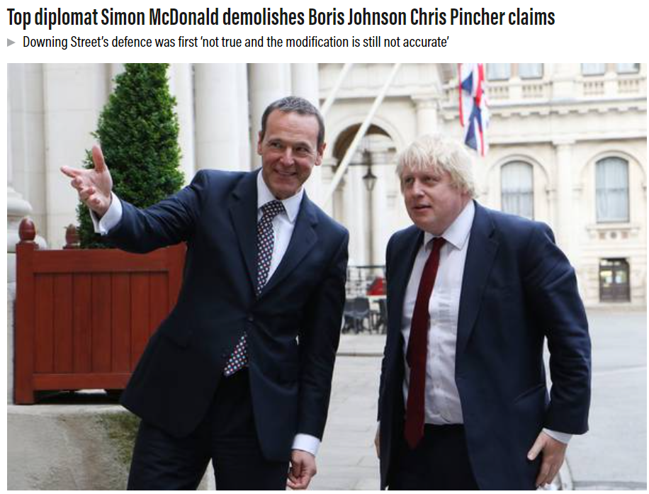 这官官相护,臭味相投的架势让英国人炸锅了:“这么烂的人你居然任命他管理保守党的纪律?还要试图把这件事儿压下去?”鲍里斯刚一开始矢口否认,说自己绝对不知道平彻的之前的事儿,然而前英国首相首席顾问多米尼克很快来打脸:鲍里斯两年前就知道平彻的咸猪手的毛病。鲍里斯立马改口,坦承自己知道但认为指控没有事实根据:“在没有事实根据的支持下,就终止平彻的任命是不公平的”。结果再一次,打脸来得太快就像龙卷风,英国前外交部负责人直接公开信举报鲍里斯:曾在2019年时亲自听取了关于平彻不当行为的调查报告。就是这一封破坏力巨大的公开信彻底把鲍里斯推入了不信任危机,也有人说麦克唐纳勋爵的证据成为了压死骆驼的最后一根稻草(final straw)。英国全国上下一片哗然:用人不察是一回事儿,知情仍然委以重任是另一回事儿!