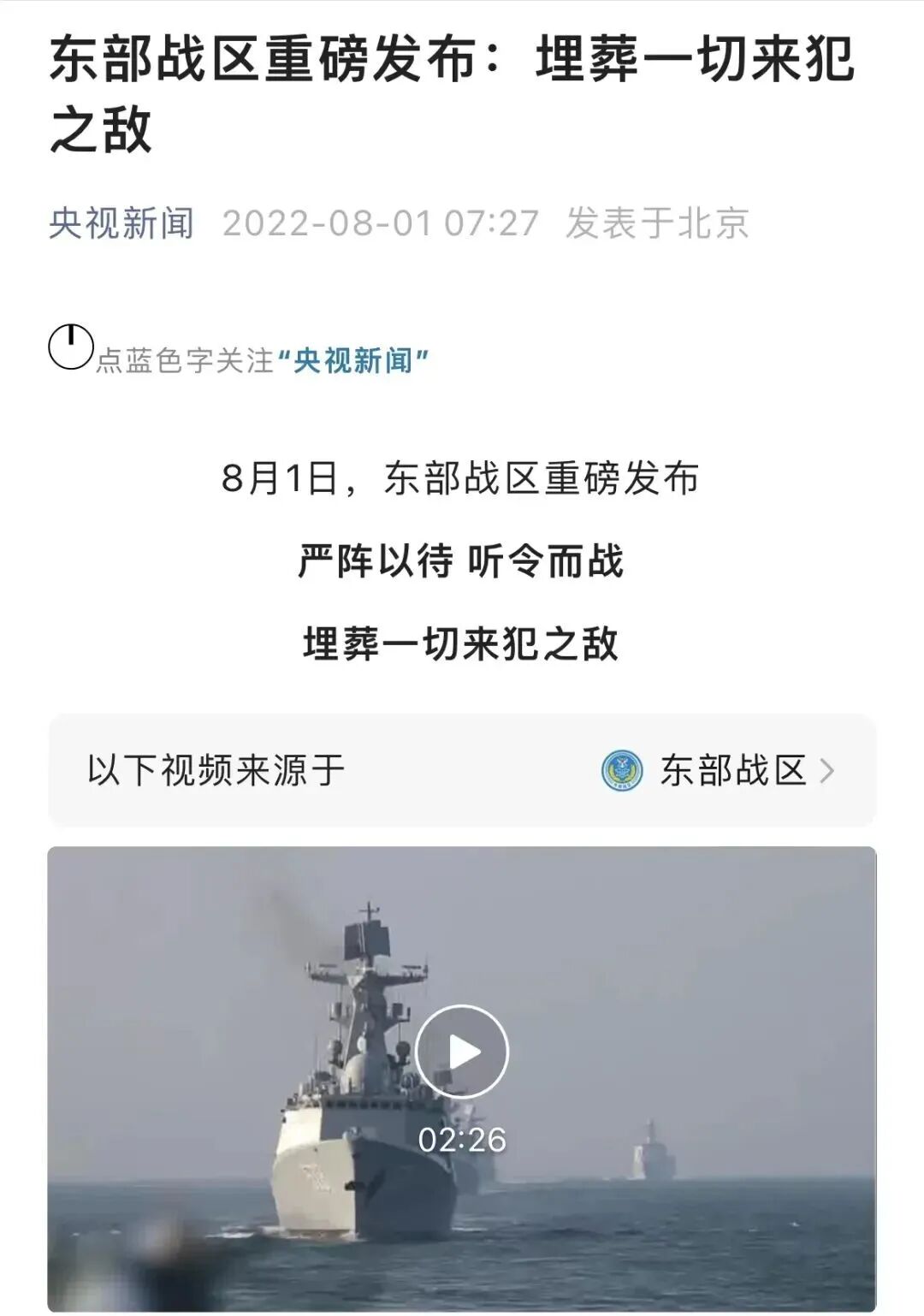 CNN还说,民进党高官称,“佩洛西将在台湾过夜”,但其没有透露“具体什么时候会到”。而该名美国官员则称,“美国防部正夜以继日地侦查中国动向,以确保佩洛西及其访问计划的安全”。北京时间8月1日下午,中国外交部发言人赵立坚在记者会上表示,佩洛西如果赴台,将是对中国内政的粗暴干涉,严重损害中国主权和领土完整,肆意践踏一个中国原则,严重威胁台海和平稳定,严重破坏中美关系,导致非常严重的事态和后果。赵立坚说:“我们要再次正告美方,中方正严阵以待,中国人民解放军绝不会坐视不管,中方必将采取坚决应对和有力反制措施,捍卫自身主权和领土完整。”当被问及佩洛西率领国会代表团访问台北的后果时,赵立坚告诉记者:“至于什么措施……如果她敢去,那就让我们拭目以待。”7月31日,美国众议院议长办公室网站公布了佩洛西“亚洲之行”的行程,出访地包括新加坡、马来西亚、韩国和日本。声明全文未提及台湾地区。同日,新加坡外交部证实,佩洛西率领的6人美国议会代表团将在8月1日至2日到访新加坡。此前,佩洛西与她的团队一直以“安全问题”为由对其出访细节进行保密。不少中外网友通过Flightradar 24等开源网站追踪消息,并分析佩洛西将如何展开她的亚洲之行。时至今日,CNN直接爆料其亚洲之行“将添加台湾一站”,现已82岁高龄的佩洛西,命运将会如何呢?美东时间07:27分,央视新闻突然发布微信文章:“东部战区重磅发布:埋葬一切来犯之敌”短文显示:8月1日,东部战区重磅发布:严阵以待,听令而战。埋葬一切来犯之敌。