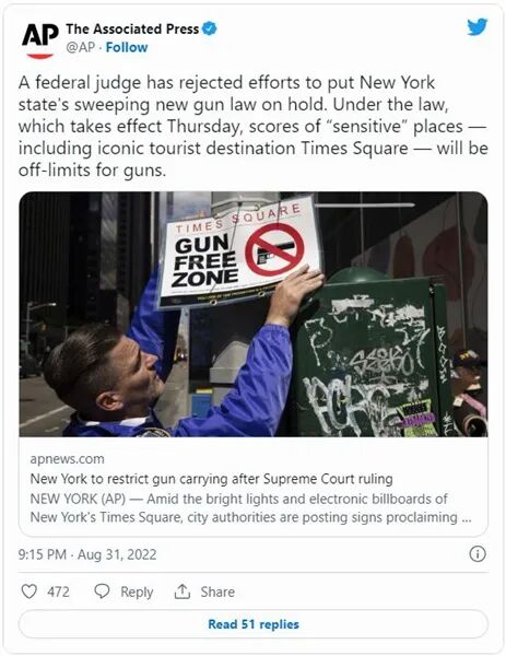昨日,纽约州长霍楚(Kathy Hochul)和纽约市长亚当斯(Eric Adams)发表公共安全讲话称:纽约州“隐蔽持枪新规”于9月1日正式生效。曼哈顿时代广场(Times Square)成为“无枪区”。