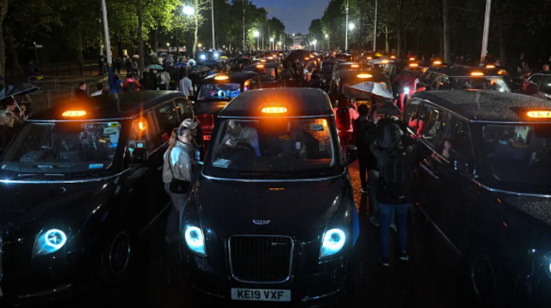 2022 年 9 月 8 日,英国伦敦,伦敦黑色出租车在通往白金汉宫的购物中心内默默地向伊丽莎白二世女王致敬。