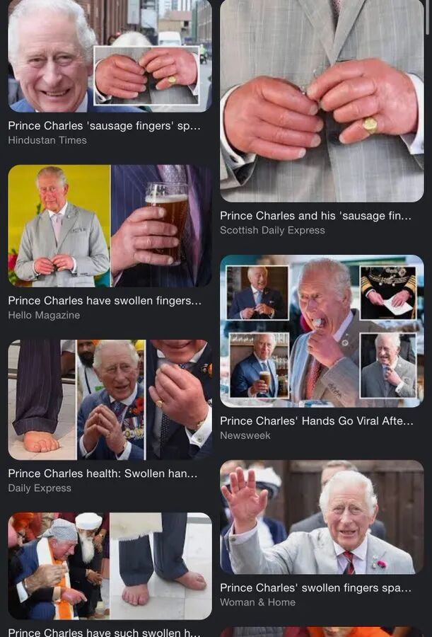 "为什么查尔斯国王的手指这么粗?这是XX的香肠串……"“这可能呢是‘杵状指’,可能是心脏病前兆。”