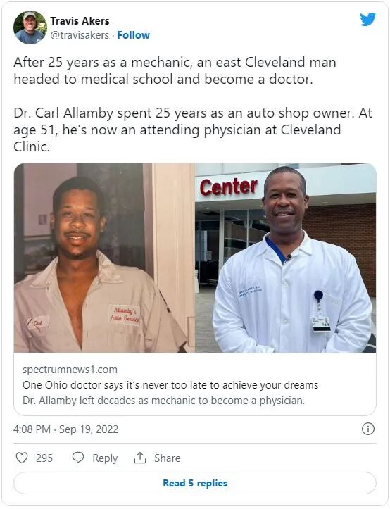之后,卡尔被克里夫兰州立大学录取,在5年多的时间里,卡尔一边学习医学课程,一边兼顾汽修店的生意,“我总是在周末、晚上或者是清晨学习,同时还要兼顾着汽修店。我不能突然放弃之前的事业,毕竟家里有很多账单要付。”