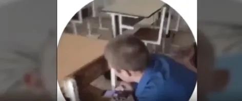 从画面可见,教室内窗户被子弹穿透击碎,有学生因为害怕躲在桌椅下哭泣