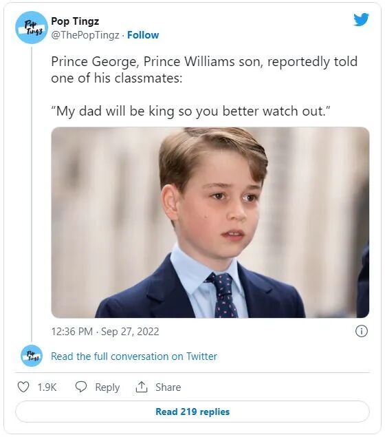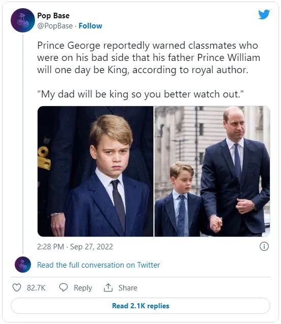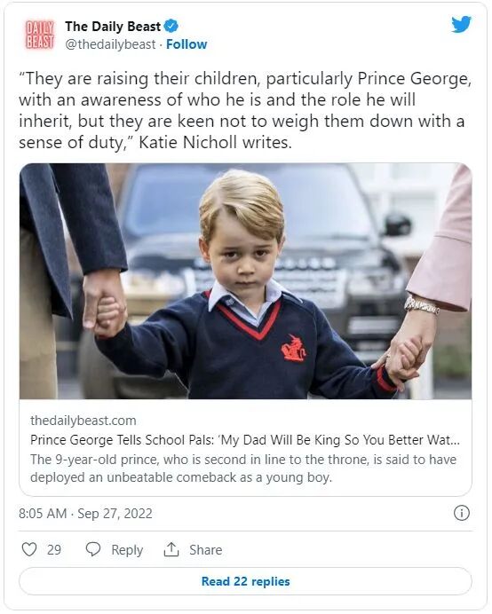 “威廉王子还没有向全世界透露他在何时、如何向长子宣布这一重大信息,也许有一天,乔治会亲自向我们讲述这个故事。不过,知情人士认为是在2020年夏天,这个男孩7岁生日前后父亲向他详细解说未来王室服务与职责,以及与此相关的生活内容。”威廉和凯特的想法其实与威廉王子自小所接受的教育息息相关——威廉的母亲戴安娜王妃一直希望可以给两个儿子威廉、哈里正常的童年,但事实上她完全没有做到。关于自己在王室命运中承担的责任,“从第一天起就以一种非常随意的方式出现在威廉王子的脑子里,蜜蜂般在他身边时刻嗡嗡作响”——这是威廉王子的不幸。因此,威廉王子与妻子凯特决定:有一天,要跟长子一起郑重地坐下来,认真地告知他所将扮演的角色和要承担的责任……但在此之外,他们还要给王子提供正常的家庭教育,总之,他们要让君主制“与时俱进,跟上时代的步伐”。