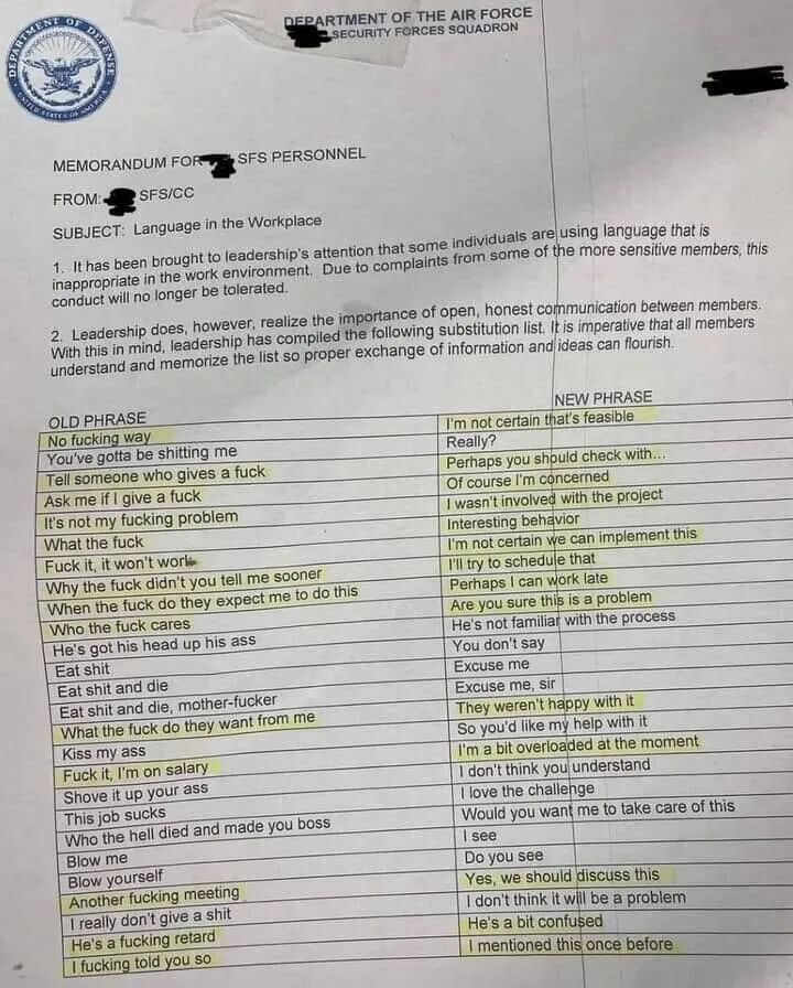 美国空军脸书粉丝专页“基地杂谈”分享了一张图片,标题为“工作场合用语”。