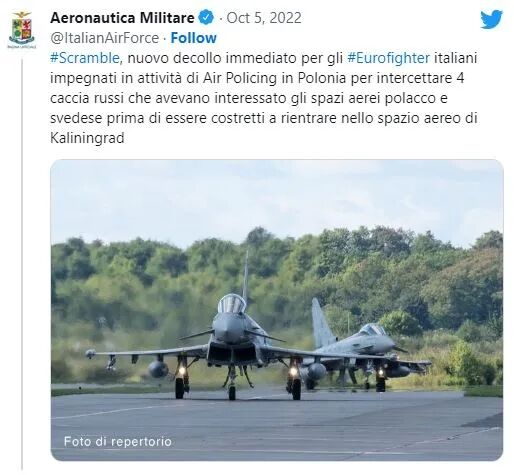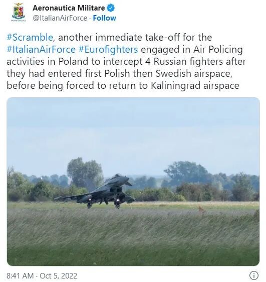 俄罗斯与西方关系高度紧张之际,4架俄国战机5日闯入波兰及瑞典领空。正在波兰参与北约任务的意大利战机紧急升空拦截,并将俄机驱离。据《新闻周刊》5日报导,这起事件发生在俄罗斯、西方和乌克兰之间高度紧张之时,特别是乌克兰近期成功的反攻行动带来了重大的军事成功。此外,俄罗斯总统普丁威胁表示,如果他的国家必须保护自己免受攻击,其将动用核子武器。北约发言人艾切劳布(Matthias Eichenlaub)告诉《新闻周刊》,意大利派遣战机是来执行北约在波罗的海地区的空中警务任务。他还表示,该地区的北约飞机会“定期拦截不遵守国际航空安全规则的俄国军机”。北约秘书长史托腾柏格(Jens Stoltenberg)上周五表示,支持乌克兰努力夺回俄罗斯军队控制的乌克兰领土。“乌克兰有权夺回现在被俄罗斯军队占领的乌克兰领土。这就是我们支持他们的原因。”