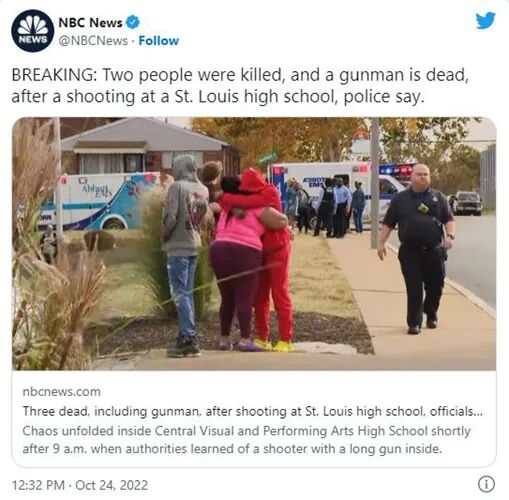 美中文网综合报道,昨日(10月24日)上午,美国密苏里州圣路易斯一所高中发生枪案,枪手在开枪打死两人、射伤多人后被警方击毙。