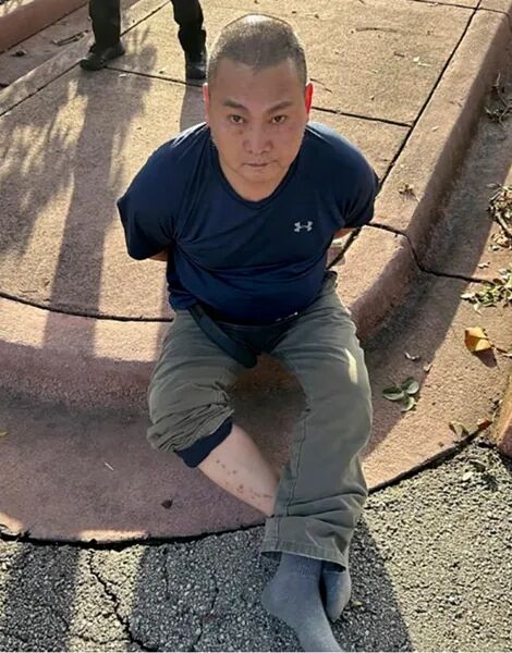 俄州调查局贴出了一张抓捕现场的照片,嫌犯陈武被捕后坐在马路边上,双手被拷在身后。