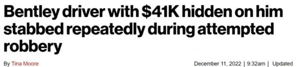 近日深夜,一名开着豪车宾利、年仅20岁的华人男子,在纽约街头遭3名华人同胞抢劫!年轻男子身中9刀,现场血迹斑斑……不过,他还是该庆幸,他随身携带的$4.1万美元现金(约合¥28.5万元人民币)得以保全……三名嫌疑人在警察赶到之前逃离现场。受伤男子被送到医院救助,目前情况稳定。纽约市警方昨日发布嫌犯作案视频,呼吁知情人提供线索。据纽约邮报等媒体报道,这起抢劫案发生在纽约市皇后区Fresh Meadows 194街与75大道路口附近,案发时间为12月9日晚上10点35分。受害男子告诉警察,当天,他刚把车停在路边,一个陌生男子便突然走近,并与他交谈。随后,受害人下车。与此同时,另外两名嫌犯靠了过来。接着,三人便对这名年仅20岁的华人学生大打出手。警方表示,根据描述,三名袭击者都是“20多岁、身材瘦削的亚裔男子”,袭击过程中,他们说的都是“普通话”。受害者也会说普通话。