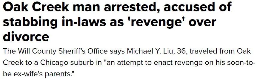 美国威斯康星州一名华裔男子,早前多次家暴妻子,妻子提出离婚,因此怀恨在心,竟远赴芝加哥企图谋杀岳父母,他对两位老人连开数枪并刀捅两人。好在岳父非常“硬核”,夺刀后自卫,反刺男子17刀!法庭记录显示,36岁的迈克尔·刘(Michael Y. Liu)在今年7月被控殴打妻子,并用锤子砸坏他们孩子的iPad。刘某表示,那段时间,他正和妻子处理离婚事宜,情绪波动比较大。但刘的妻子则告诉警官,刘某有家暴史,那次并不是自己第一次被打。警方透露,在那次家暴后的第二天,刘某多次给妻子打电话,违反了禁止接触令。此外,刘某还告诉朋友“我想杀死一个孩子然后自杀”,但刘某后来又告诉警察“这是一个玩笑,不是认真的”。11月30日,威斯康星州的法官詹妮弗·多罗(Jennifer Dorow)开庭审理此案,刘某被裁定犯有家庭暴力罪及违反保护令,判处4个月监禁。法官给了刘某两天时间,让他收拾收拾于12月2日前往沃基夏郡胡贝尔拘留所报到。但刘某竟利用这两天时间,去实施了他的“大行动”!刘某从威斯康星州赶去了位于伊利诺伊州的岳父母家,目的只有一个,就是报复想与他离婚的妻子。12月1日下午6点40分左右,警方接到报警后,赶到Shady Grove Court 2600号,发现了倒在血泊中的两位老人和刘某本人。屋内墙壁上有枪孔,三人身上均有多处刀伤,正大量流血。警方立即将三人全部送往医院抢救。据老人事后回忆,当天,刘某到他们家时,两位老人正坐在客厅看电视。刘某直接掏枪,对着他们一通扫射。不过,其“枪法太差”,“未造成实质伤害”。