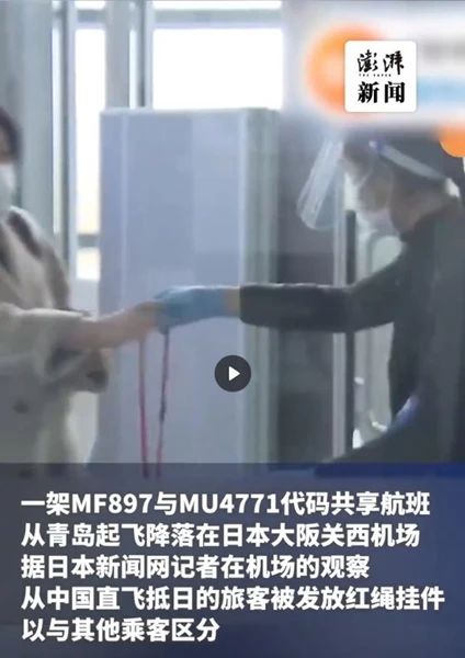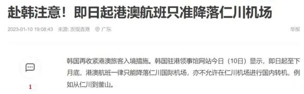 ↑↑↑关键是,这隔离的条件也太凑活了吧——地铺垫子、矮桌子,然后……然后就没有然后了。不仅如此,韩国方面还效仿日本,刻意减少了来自中国的航班数量,并要求所有从中国(内地)赴韩的飞机,只能降落在仁川机场……以上种种,令中方愤怒。1月10日,中方终于出手,祭出反制措施:从1月10日起,暂停签发韩国公民赴华短期签证。中方特意点明,“是否调整上述措施,要看韩国方面的态度”。但是,情况并未因此好转——韩国好像就是想和中国杠。在中国打响反制第一枪之后仅仅3个小时,韩国就作出回应。韩国外交部称,“韩方一直在向中方传达科学防疫的立场并就此展开沟通。对于中方的反制措施,韩方表示遗憾。”韩国政府同时宣布,“从即日起,所有来自香港和澳门的航班,只能统一降落在仁川机场。而且,不允许来自港澳的旅客在仁川机场转乘内陆机前往其他城市,想去釜山或者济州岛的旅客只能自己想办法找其他交通工具。”需要说明的是,韩国此前颁布的严苛防疫措施针对的仅是“来自中国内地的旅客”,港澳地区原本不受限制。现在,韩国增加了对来自港澳地区旅客的管制,明显是在“加码”,是对中方最新“停发签证决定”的强势回应。昨日,中国驻日本大使馆也发布通知,“暂停审发日本公民赴华普通签证,即日起实施,何时恢复,请候通知”。目前,日本要求来自中港澳地区的入境旅客(无关国籍)在入境时进行核酸检测,阳性者隔离7天。据澎湃新闻报道,“当地时间1月9日,一架从中国青岛起飞的航班降落在日本大阪关西机场。据日本新闻网记者在机场的观察,从中国直飞抵日的旅客被发放红绳挂件,以与其他乘客区分”。不过,报道没有提及红绳挂件上的内容细节。