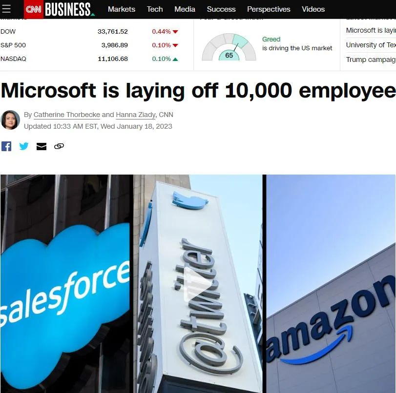 继亚马逊,Meta,Twitter,Salesforce等公司宣布大规模裁员后,科技界的巨头公司微软也于今日宣布“将裁员10000人”,希望在经济不确定的情况下削减成本,并重新专注于人工智能(AI)等战略重点。