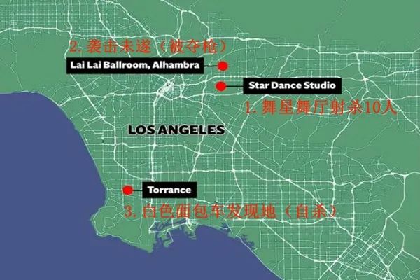 据美联社报道,枪手自杀身亡的白色面包车在洛杉矶南部小城托伦斯(Torrance)被发现。此地距枪手一度闯入、准备发动袭击的第二个地点(Alhambra Lai Lai舞厅)相距大约35公里。与蒙特利公园市一样,托伦斯也是一个亚裔美国人人口比例较高的社区。