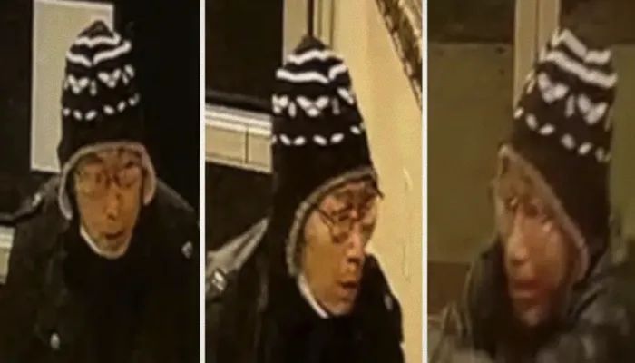 洛杉矶县警方周日上午发出的嫌疑人监控截图:亚裔男性,较深肤色,高约177cm,重约68公斤。案发时戴黑框眼镜,针织帽,身穿黑色皮外套。