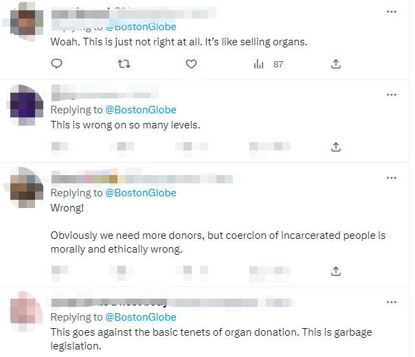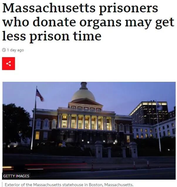 什么条件下,监狱里的囚犯可以获得减刑?协助警方调查?阻止他人重大犯罪活动?最近,美国马萨诸塞州议会,给了这个问题一个简单粗暴的答案 —— 想减刑?拿自己的骨髓或者器官换。最近,马萨诸塞州的议员兼民主党派人士 Carlos González 和 Judith A. García 共同提交的一项新法案,叫做“骨髓和器官捐赠计划”。该法案旨在在该州惩教部门内建立一项捐赠计划,以帮助该州近 5,000 名在器官移植等候名单上排队的居民。为保证该法案的合法性,将设立一个五人委员会,该委员会负责确定谁有资格参与,以及捐赠类型与减刑之间的联系,不会有财务支付。法案一旦成立,那么从此以后,被关押在该州惩教场所的人,一旦参与器官或骨髓捐赠,就可以获得60-365天的减刑。该法案的两位发起人声称:“这是将恢复人身自由的权利交给被监禁的人”。其中一位发起人Carlos Gonzalez 表示,这个法案的部分灵感来自于他的一位密友,该密友患有四期肾功能衰竭。他说:“我爱的我的朋友,我祈祷通过这项立法,这样可以延长他和任何其他处于类似生死攸关的人的生命。”绝大多数网友认为这是“大错特错”,“极有可能引发强迫捐献等压迫性事件”,“不道德,违背基本人权”。也有少部分网友表示,“100%支持捐献器官,但减刑就免了吧。”