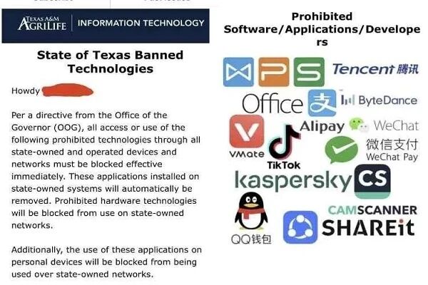 某华人论坛用户近日分享,得州农工大学(TAMU)的学生收到IT部门通知,学校将禁止所有(中国)国有与国营的设备,以及抖音、支付宝、微信、QQ、WPS等应用软件。
